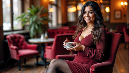 A woman stands in a beautifully arranged café, holding a coffee cup and saucer. She is dressed in a form-fitting burgundy dress, exuding confidence and charm.