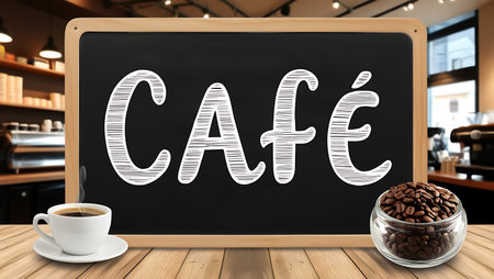 Cafe chalkboard on wooden table in coffee shop 3D rendering
