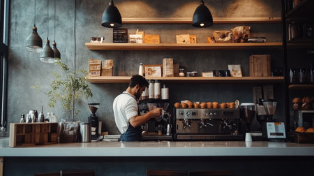 A sleek coffee shop counter with a barista making espresso, modern decor, and a display of freshly roasted beans and baked goods -