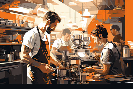 charming coffee shop setting, baristas skillfully brew aromatic coffee.Generated with AI