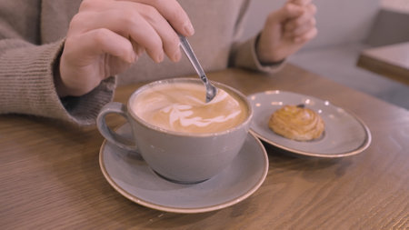 Stirring latte coffee with a spoon and a cookie lying on a plate. Action. Close up of woman hand stirring foam of her coffee while sitting at the restaurant.