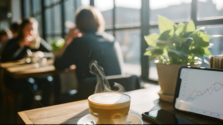 A close-up of a hot coffee cup with steam rising, set on a wooden table in a bustling cafe filled with people enjoying their drinks and conversations.