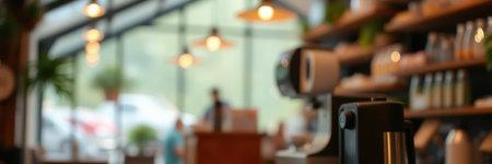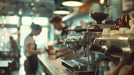 Cozy interior of a modern cafe featuring warm lighting and a coffee machine in focus during a busy afternoon