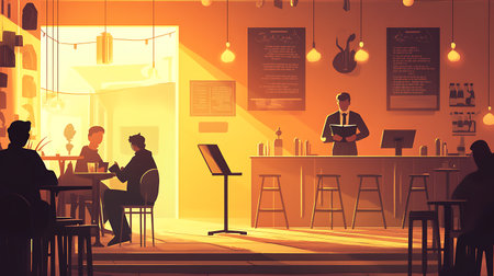 A cozy coffee shop corner with wooden tables, warm lighting, and people chatting in a relaxed atmosphere.