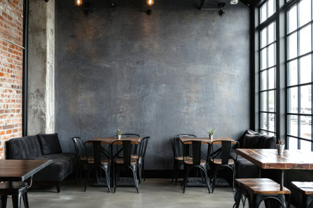 A photograph of an empty wall in the interior design style of an industrial loft, featuring gray walls and black furniture with wooden accents. The room includes two desks on one side and chairs around tables placed opposite each other. There's also a sofa against another window, creating a cozy atmosphere. --ar 3:2 --v 6.1 Job ID: 1caa7469-f1d0-4c75-807e-4c61367f2483