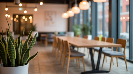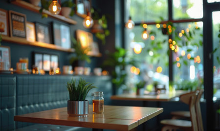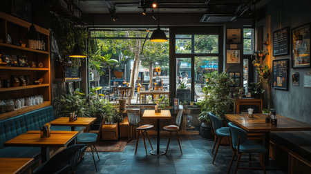 A charming cafe interior featuring warm pendant lighting, lush plants, and a wooden counter. The modern design creates an inviting ambiance for relaxation.