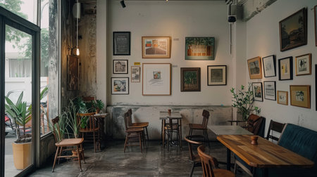 A bohemian-styled cafe space, replete with an eclectic wall art gallery, vintage wooden seating, and a relaxed, artistic vibe.