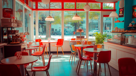 This cozy coffee shop interior boasts vibrant teal walls, vintage furniture, and a mix of colorful decorations Warm lighting fills the space, streaming in through large windows with natural light