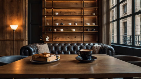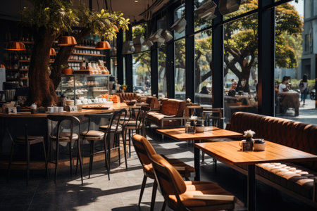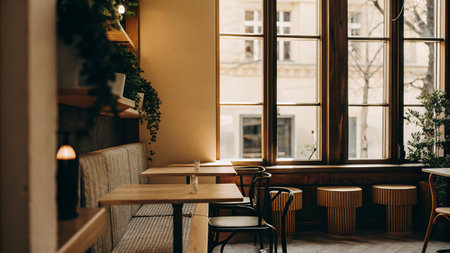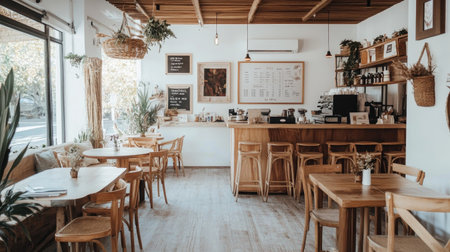Cozy cafe interior with wooden furniture and natural light during daytime