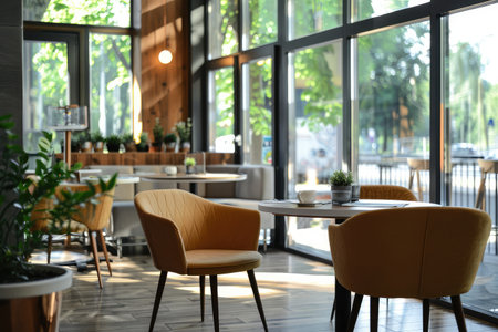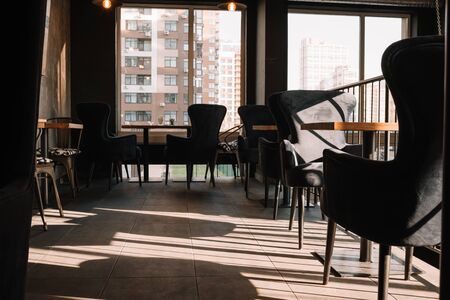 Modern cafe interior with chairs and eating tables with sofa, panoramic window