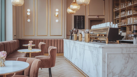 Elegant coffee shop interior with marble counter and cozy seating during daylight