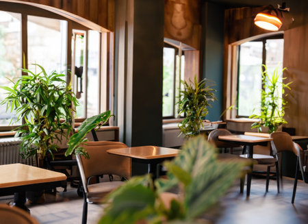 Indoor interior cozy luxury retro wooden cafe coffee shop with plants. with copy space
