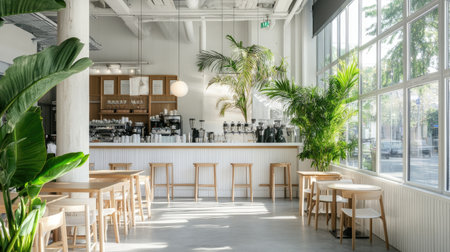 A chic cafe with white accents, earthy wood textures, and tropical green plants. Natural light fills the space through expansive glass panels.