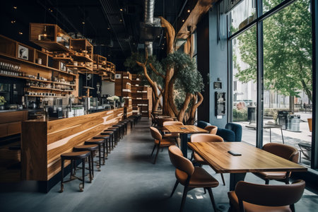 Empty coffee shop with large windows, wooden tables and chairs, and a modern bar area