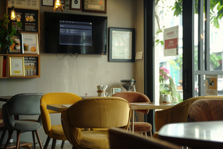 Cozy Modern Cafe Interior with Static TV Adding Artistic Touch for Relaxed Ambiance