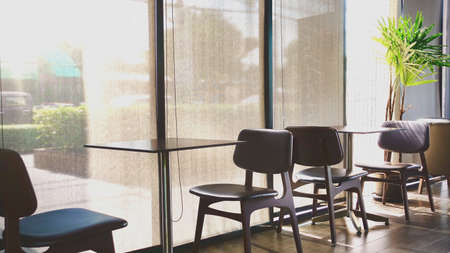 interior of restaurant cafe with window glass with window blinds and table with chair against green color of tree