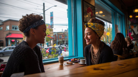 Two friends enjoying warm conversation in cozy cafe, surrounded by vibrant decor and lively street view. Their joyful expressions reflect deep connection and shared moments