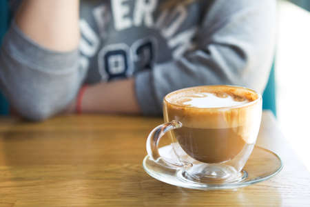 A cup of latte on a wooden table in a cafe on a cold working morning