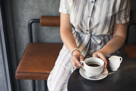 Generative AI : Hands woman hold coffee cup on the table at coffee shop cafe