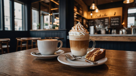 Warm beverages and a slice of cake served in a cozy cafe setting during the afternoon in a city