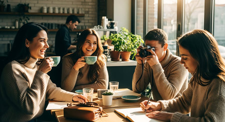 A cozy coffee shop corner with wooden tables, warm lighting, and people chatting in a relaxed atmosphere.