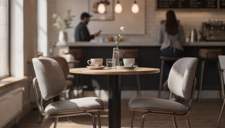 Chic cafestyle visitor nook with a closeup on the main table and chairs as surrounding patrons and decor gently fade into the background.