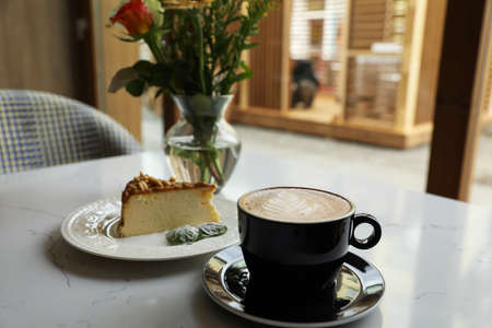 Cup of fresh coffee and dessert on table in cafeteria