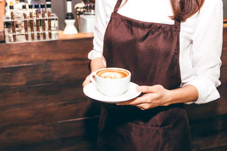 A female barista holds a cup of hot latte in her hand in a cafe. A waitress preparing a customer order.