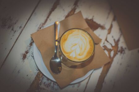 Sideway shop coffee, a cup of hot latte art coffee on the table.