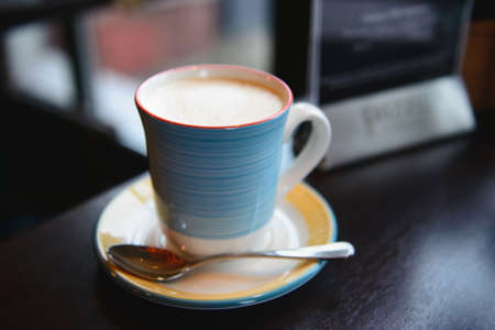 The hot cappuccino cup, decorated with milk foam and sprinkled with coffee powder, gives a very pleasant feeling to drink with copy space