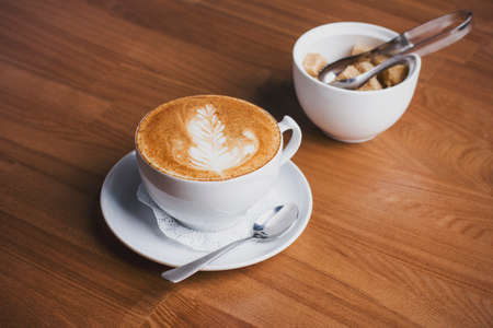 The cup of cappuccino and sugar bowl with brown sugar on a wooden background
