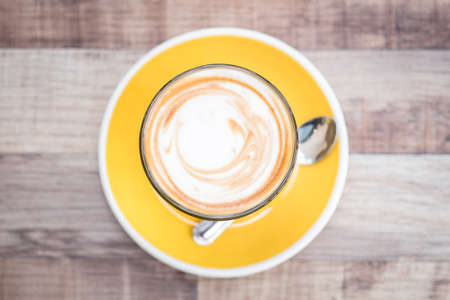 View from above. White cup of coffee, latte or cappuchino with marshmallow on wooden bar counter in cafe.