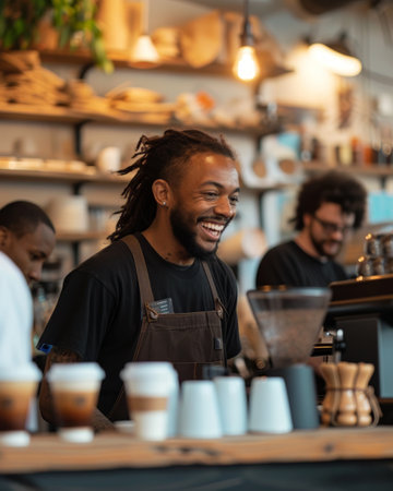 The hustle of a busy coffee shop with patrons enjoying their drinks and baristas crafting coffee, creating a lively community space. Resplendent.
