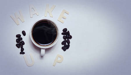 Abstract Coffee Cup And Coffee Beans And Wooden Letter Images Awakening concept, top view Text copy space Focus on the coffee cup.