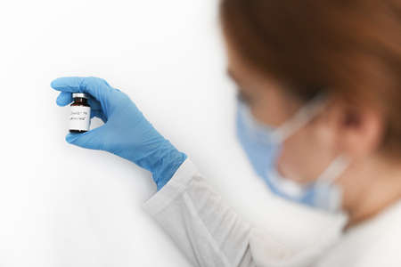 Female doctor holding in her hand coronavirus vaccine - covid-19 health concept