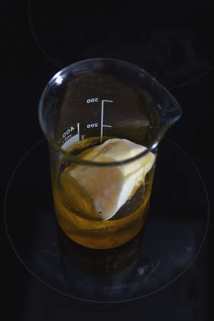 Top view of solid butter and plant based oil mixed in glass flask on ceramic stove surface