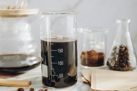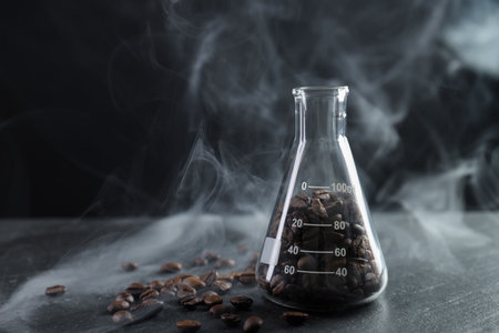 A close up shot of coffee beans in laboratory glassware