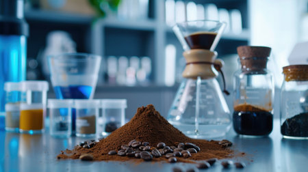 A vibrant scene showcasing coffee preparation with ground beans, laboratory glassware, and colorful ingredients, emphasizing the science of brewing.