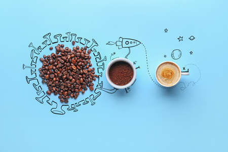 Funny composition with cup of coffee, roasted beans and powder on color background