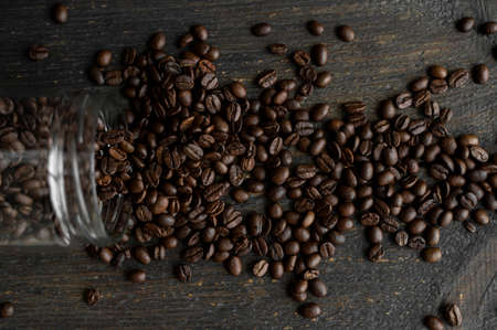 Roasted fresh arabica coffee beans scattered on a table from a little jar on a wooden table. Fresh coffee beans.