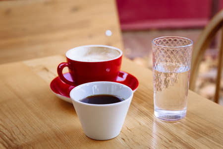Aromatic coffee in a red cup with milk foam and coffee in a white cup.