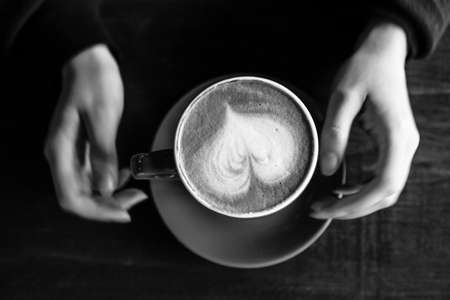 Hands holding cup of hot coffee latte with heart shaped foam art