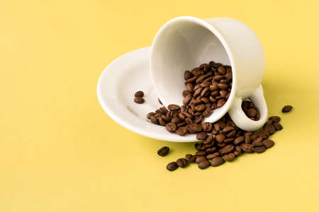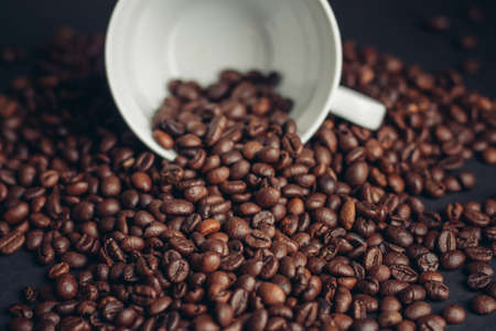 Close up coffee bean spilt from white cup on a rock stone slate. Selected Focus. Copy Space Concept