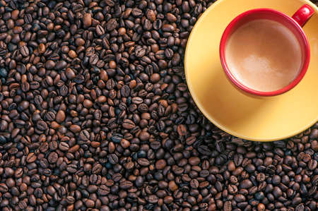 Cup of coffee with roasted coffee beans background. Mug of black coffee.