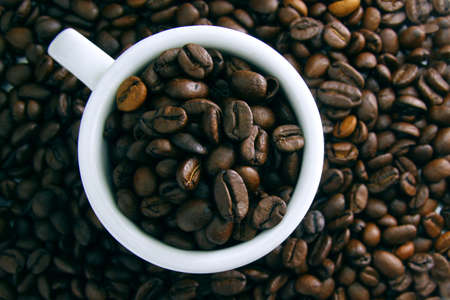 Coffee beans in a mug, Cup of coffee full of coffee beans, Coffee cup with roasted beans on stone background. Top view with copy space for your text, Coffee cup and coffee beans on wooden background. Top view.