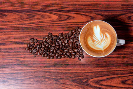 Coffee cup with heart in coffee shop, top view close up photo.cappuccino in pink cup with latte art and roasted coffee beans on wooden table blurred background