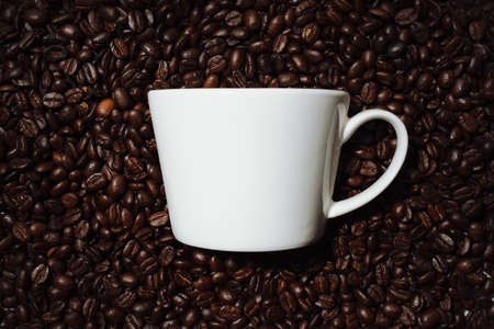 White big mug on whole roasted coffee bean textured background. Morning routine caffeine dose health benefits