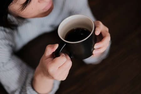 Close up of hand young asian woman siting on chair and holding coffee cup to drink with small cactus in white pot and dry leaf in glass on table
