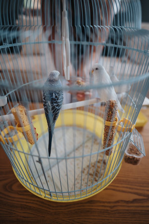 Two budgerigars perch together inside a wire cage, creating a charming visual of companionship and serenity. A person gazes at them, adding a touch of human connection and warmth to the scene.