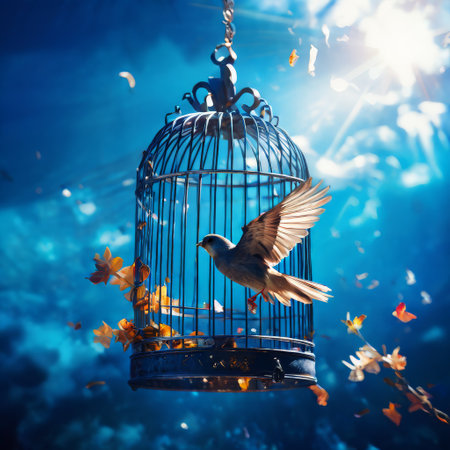 A bird takes flight near a cage in silhouette against a warm sunset. The image features a shallow depth of field, with soft focus on the background, emphasizing the bird's freedom. The composition suggests themes of liberation and overcoming limitations, ideal for editorial or commercial projects.